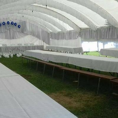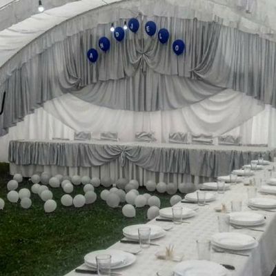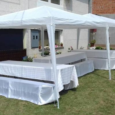4.6Beli i sivi šatori sa svom pratećom opremom, hladnjače, dekoracije, svila, baloni i sveće. Osmislite svoju proslavu na otvorenom uz mogućnost iznajmljivanja šatora kapaciteta do 180 mesta. Cena iznajmljivanja zavisi od vaše lokacije, prevoza i broja gostiju.